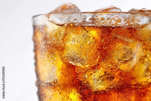 Iced carbonated beverage with ice cubes and bubbles
