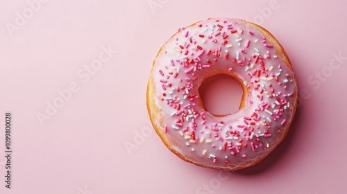 Iced strawberry donut on a soft pink background Colorful sprinkled glazed treat in a flat lay arrangement