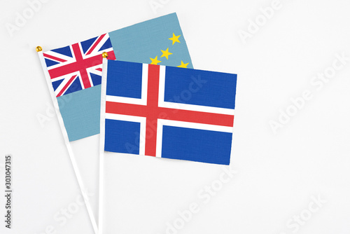 Iceland and Tuvalu stick flags on white background. High quality fabric, miniature national flag. Peaceful global concept.White floor for copy space.