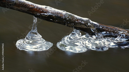 Icicles shaped by water in a forest stream