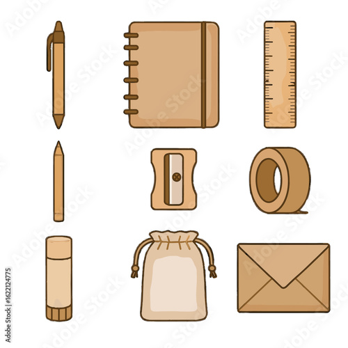 Icon recycled stationery tape eco bamboo vector envelope wooden ruler glue fiber