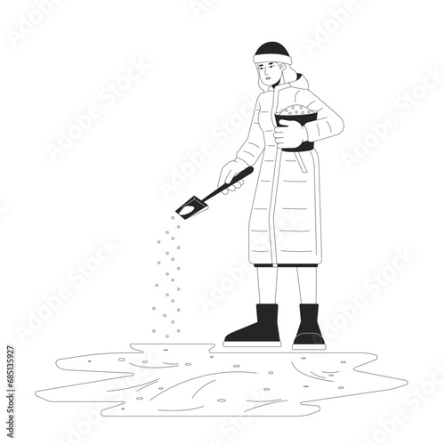 Icy walkway prevention black and white cartoon flat illustration. Caucasian woman treating ice on sidewalk 2D lineart character isolated. Spreading sand on road monochrome scene vector outline image