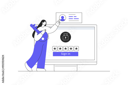 ID verification, identification for access to personal data information. Woman with key, login and password form page. Flat Cartoon Vector Illustration, icon Stylish abstract design landing page web