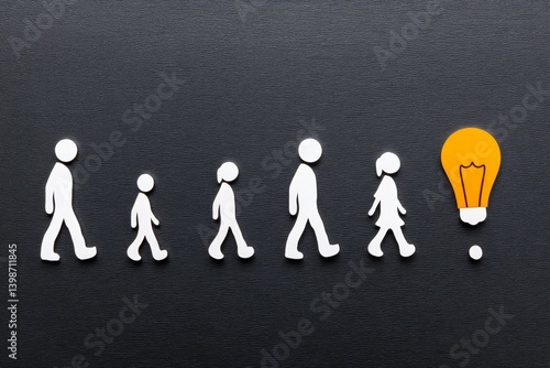 Idea Generation and Growth - White figures walking towards a bright lightbulb, symbolizing innovation and progress