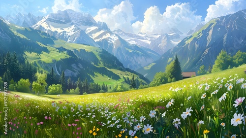 Idyllic mountain landscape in the Alps with blooming meadows in springtime.