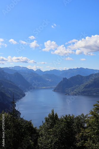 Idyllic panorama of mointain Lake Traunsee in Gmunden Austria