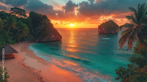 Idyllic sunset over tropical beach with cliffs and palm trees.