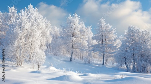 Idyllic winter landscape with snow-covered trees and soft blue sky