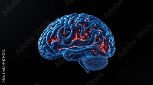 Illuminated 3D model of a human brain, showcasing neural pathways and activity