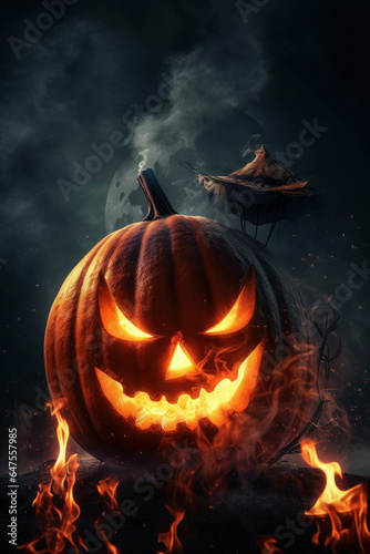 Illuminated and terrifying pumpkin for Halloween. Generative AI.