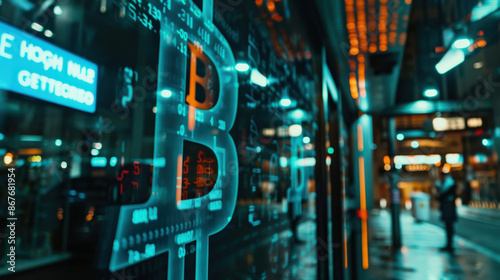 Illuminated Bitcoin symbol on a digital screen with financial data in a city at night