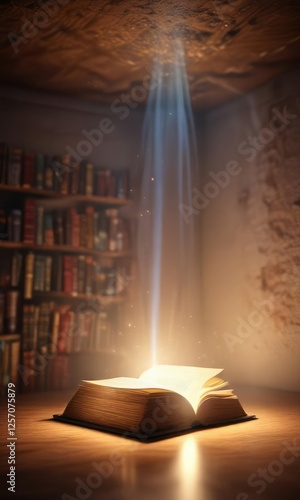 Illuminated book with a beam of light radiating from the ceiling, spiritual guidance, heavenly illumination