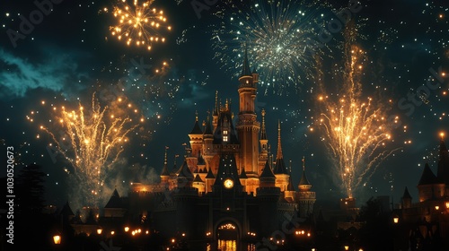 Illuminated Castle Scene with Nighttime Fireworks Display
