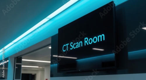 Illuminated CT Scan Room Signage in a Modern Hospital Setting, Blue Aesthetic