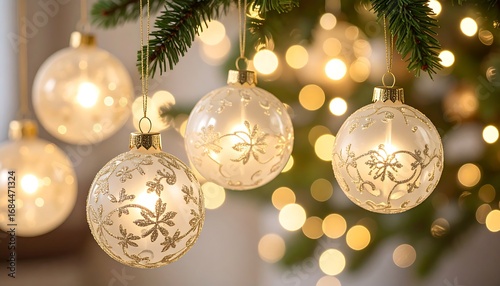 Illuminated, decorative Christmas ornaments, featuring delicate golden designs and soft, warm light, hanging from a Christmas tree.