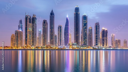 Illuminated Dubai Skyline at Dusk Reflecting in Calm Waters