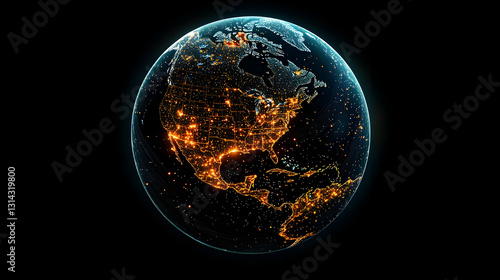 Illuminated Earth At Night From Space Featuring North America With Orange And Blue Lights On A Black Background 3D Rendering