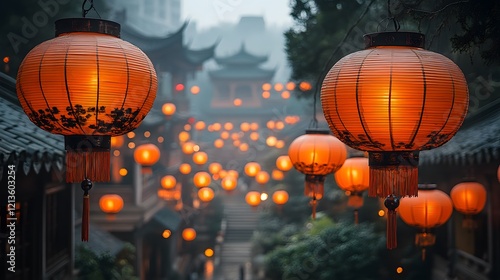 Illuminated Lanterns Hanging, Misty Asian Town, Festival