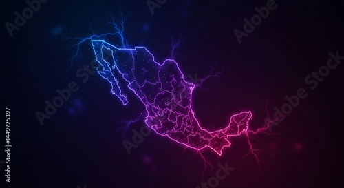 Illuminated Mexico Map Glowing with Neon Energy Outlines and Lightning Effects