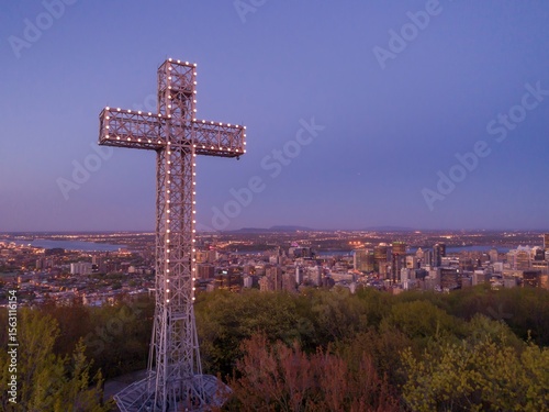 Illuminated Mount Royal Cross overlooks Montreal, Canada, at dusk. The landmark symbolizes the city's heritage and offers panoramic views.