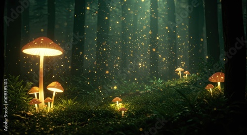 Illuminated mushrooms in a mystical forest