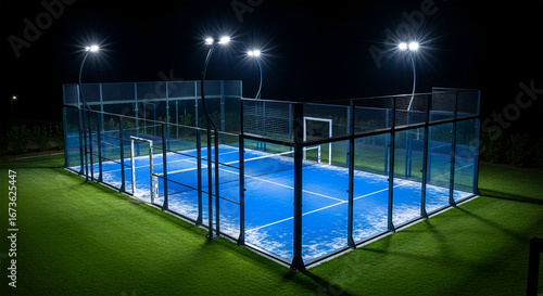 Illuminated padel court at night, showcasing the blue surface and surrounding lights.