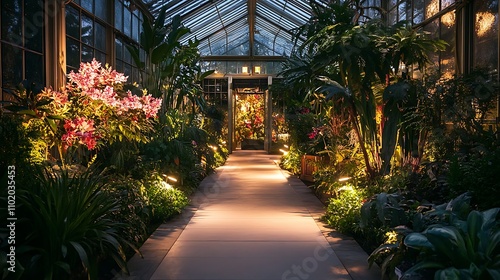 Illuminated Pathway Through a Lush, Nighttime Conservatory