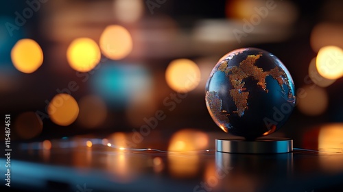 Illuminated Rotating Globe on Dark Surface with Bokeh Lights