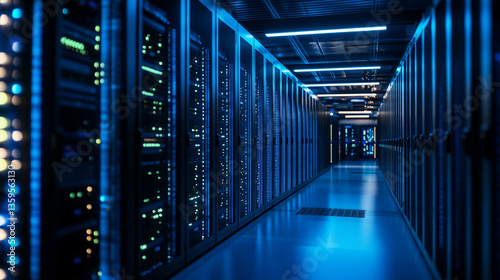 Illuminated server room hallway with blue lighting and rows of data storage racks visible