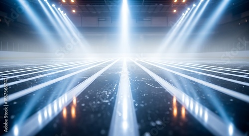 Illuminated Stage: Powerful beams of light emanate from the ceiling, illuminating a performance space in a mesmerizing spectacle of vibrant energy, where anticipation hangs heavy in the air.