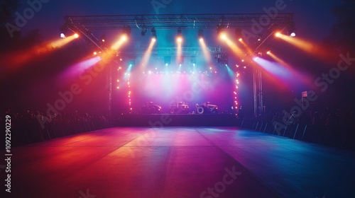 Illuminated stage with colorful lights and a blurred crowd.