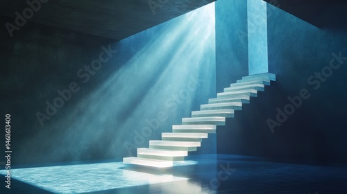 Illuminated staircase ascending to a light-filled space.
