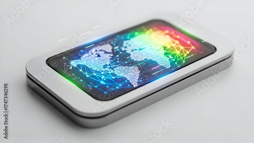 Illuminated World Map Displayed on Sleek Silver Device with Netw