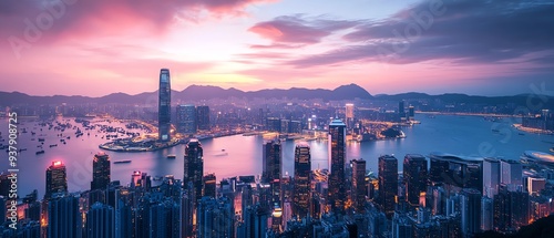 Illustrate the evolution of technology with a dynamic wide-angle view of a futuristic cityscape at dusk, blending sleek skyscrapers and innovative transport networks seamlessly