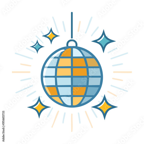 Illustrated disco ball with surrounding bright sparkles and light rays party celebration