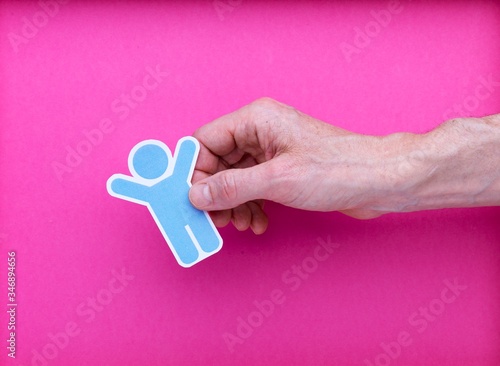 Illustration concept enfant seul isolé dessin dans une main homme adulte sur arrière-plan rose