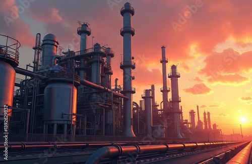 Illustration industrial factory tubes plant pipes during sunset. Industry oil gas production refinery structure modern metal technology innovation energy manufacturing.