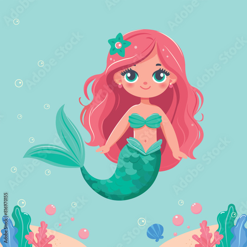 Illustration of a Beautiful mermaid girl with beautiful eyes and red hair. Vector Illustration. Flat style