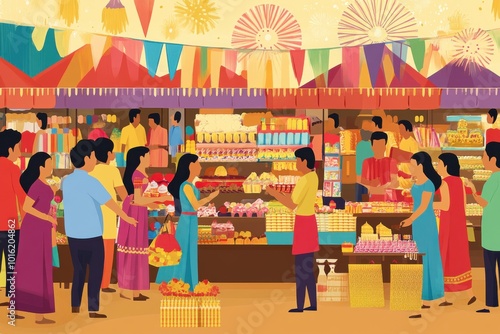 Illustration of a bustling Deepavali market with stalls selling colorful sweets, fireworks, and decorative items, surrounded by people in traditional clothing, celebrating with joy