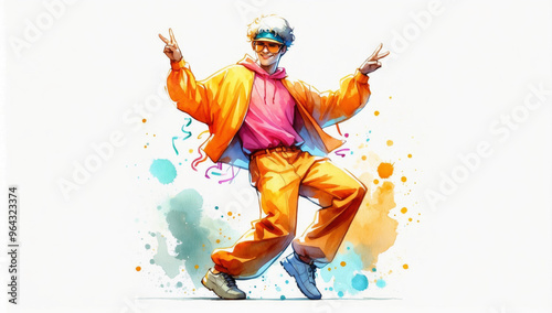 Illustration of a cheerful guy in bright retro street clothes dancing and showing peace signs