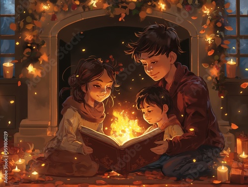 Illustration of a family reading a Christmas storybook by the fireplace, calm and magical