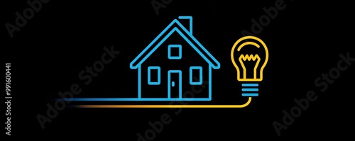 Illustration of a house connected to a light bulb through electricity cables symbolizing energy efficiency and modern technology