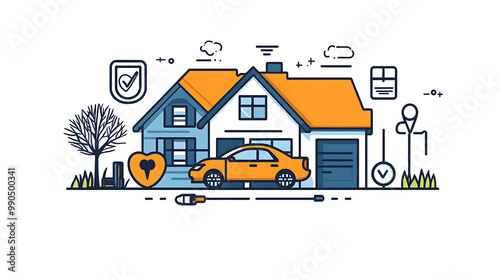 Illustration of a house with a car in the driveway, surrounded by a yard and other home elements.