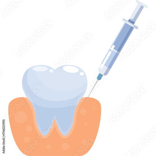 Illustration of a large white tooth receiving injection from a blue and white syringe in orange gums on a transparent background suitable for dental care and medical concepts