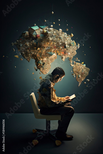 Illustration of a man reading a book that connects him to the world in a creative way created with Generative AI technology
