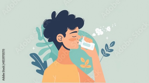 Illustration of a man using an inhaler outdoors with green leaves and white flowers in the background.