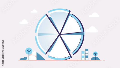Illustration of a pie chart with six slices and a light blue color scheme in a landscape scene