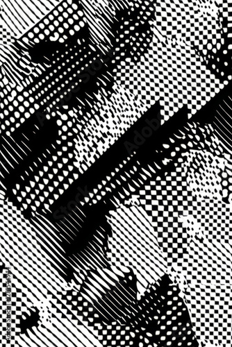 Illustration of an intricate houndstooth pattern in black and white, with sharp, geometric lines creating a sense of movement. The classic design is given a modern twist, perfect for both fashion and