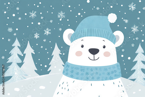 Illustration of cartoon polar bear in a blue hat and scarf in snowy forest background with snowflakes falling