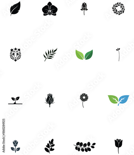 Illustration of collection of various botanical icons and symbols leaves, flowers, and sprouts